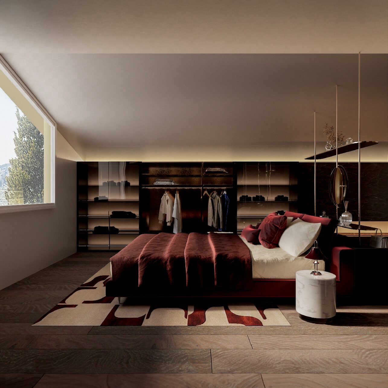 La zona giorno è caratterizzata da un ampio e luminoso salotto, impreziosito da grandi vetrate che lo mettono in dialogo diretto con l’esterno, creando un’atmosfera calda e accogliente. Gli ambienti si sviluppano su due livelli sfalsati: un salone rialzato che si apre sulla sottostante sala da pranzo, generando un gioco di quote che dona ritmo, profondità e continuità visiva agli spazi. Al piano superiore si trova la suite padronale, un rifugio intimo e riservato, completo di bagno en suite e cabina armadio, pensato per offrire massimo comfort, privacy e una vista panoramica. L’ambiente, raccolto sotto un tetto spiovente che si apre verso il salone e il paesaggio circostante, è dominato da un elegante letto centrale in pelle pregiata, vero protagonista della scena.
